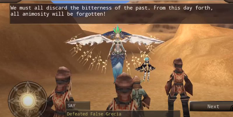 The Inje people were shocked that the Grecia appeared to them and grace in their presence to them in her real form. She give the speech to end war with Diels and to move on. This is because she afraid the negative energy will be used by the survived crystal to regain power and wreck havoc again on the land.